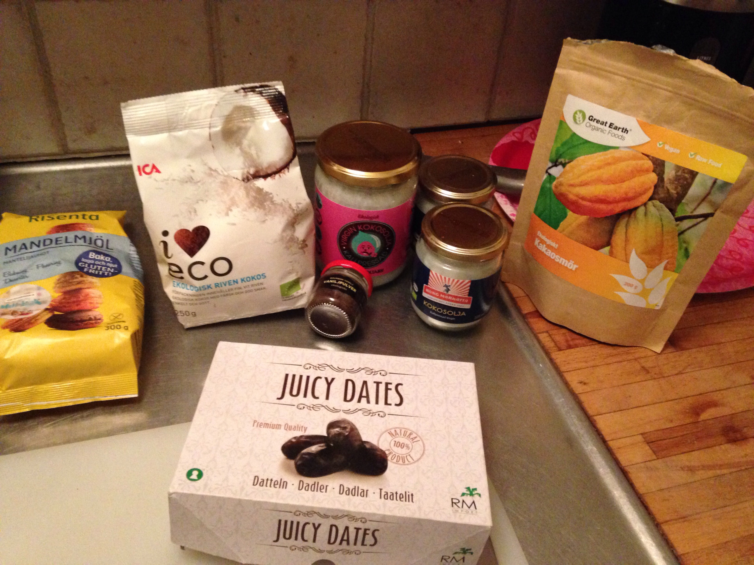 Alla torra ingredienser kör jag till ett pulver i matberedaren, tillsammans med de färska urkärnade dadlarna.