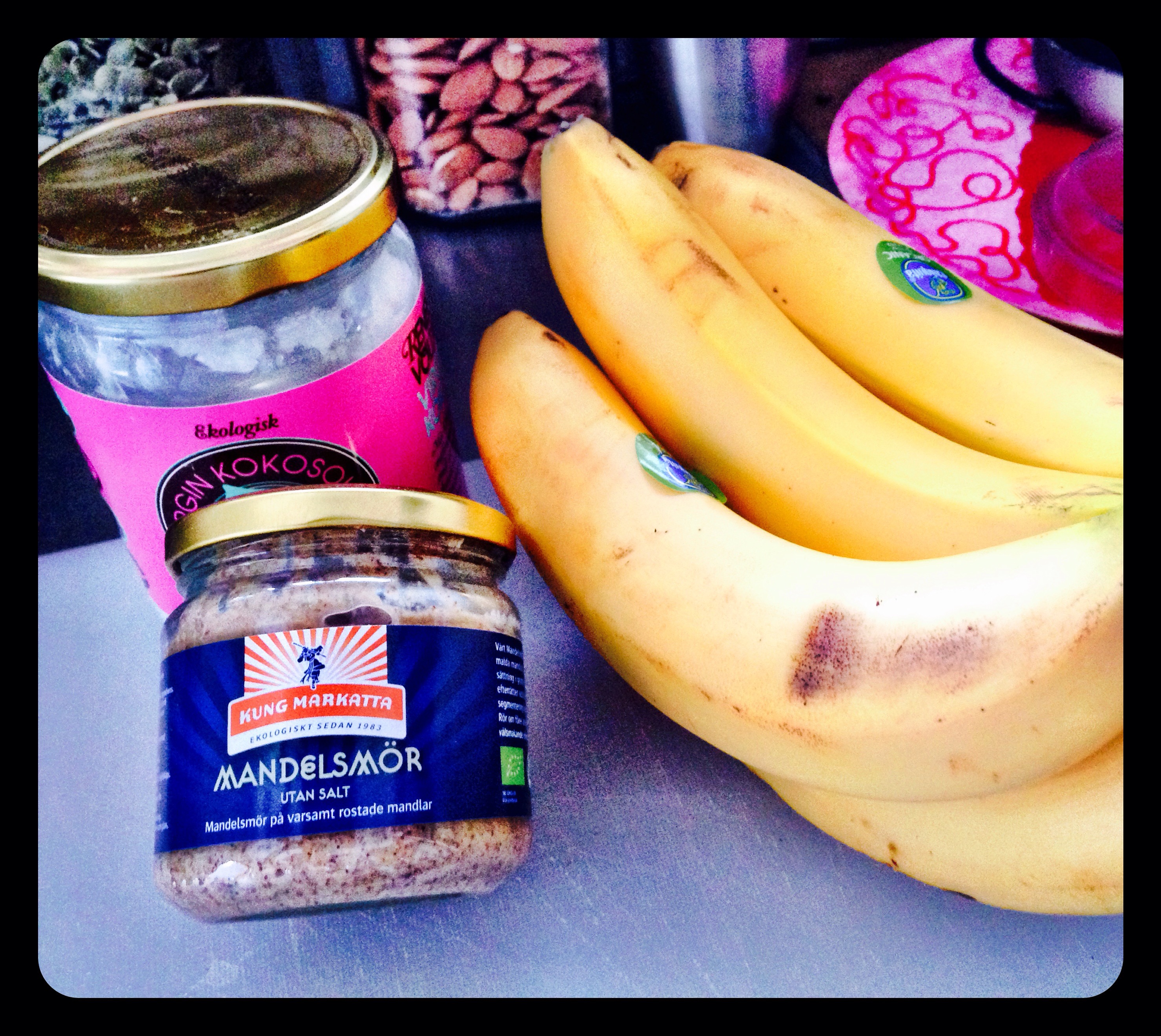 Blanda tre mogna bananer med 1-2 msk mandel eller hasselnötssmör i matberedaren. Tillsätt 3 msk kokosolja. Kör till en slät smet.