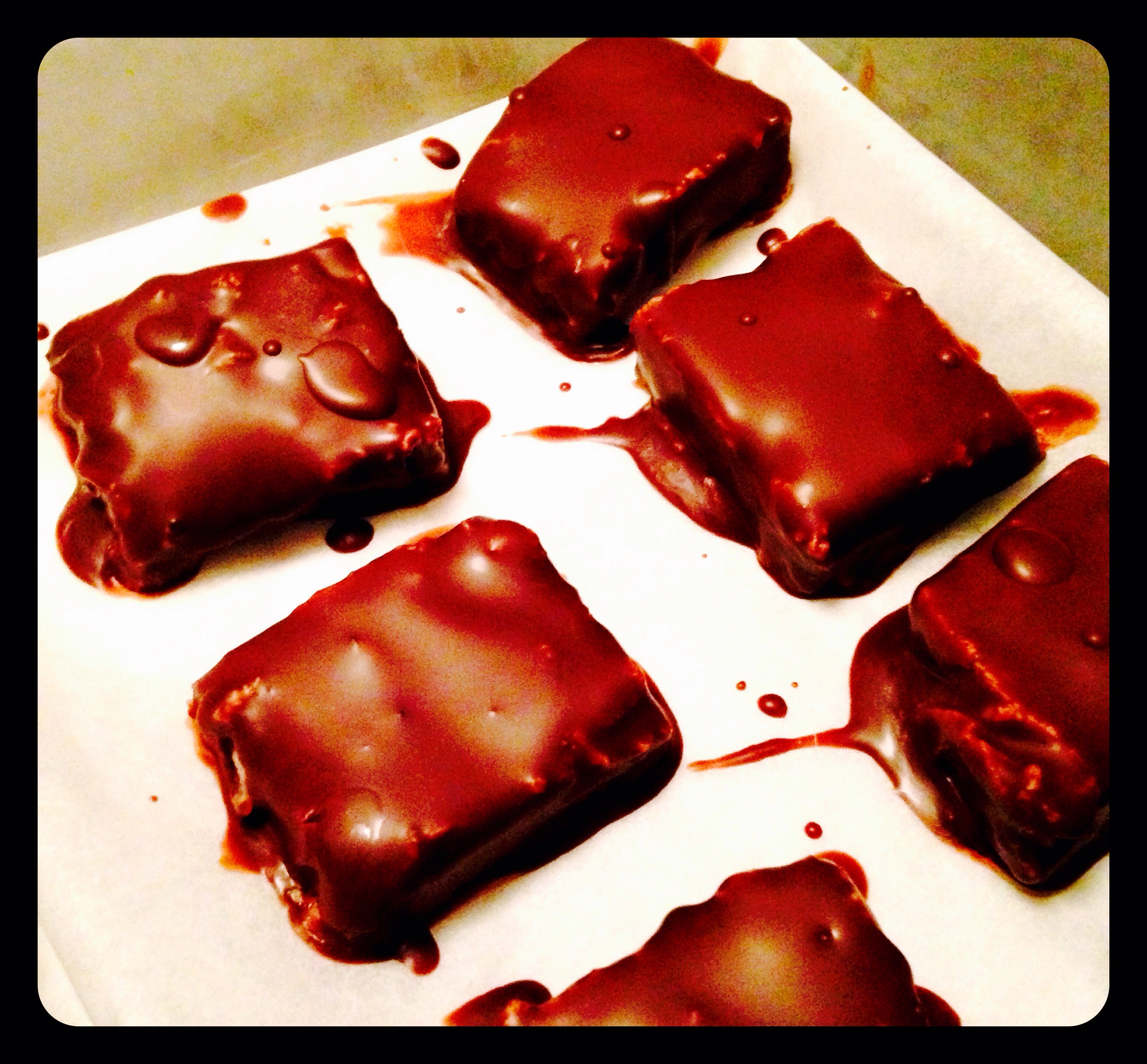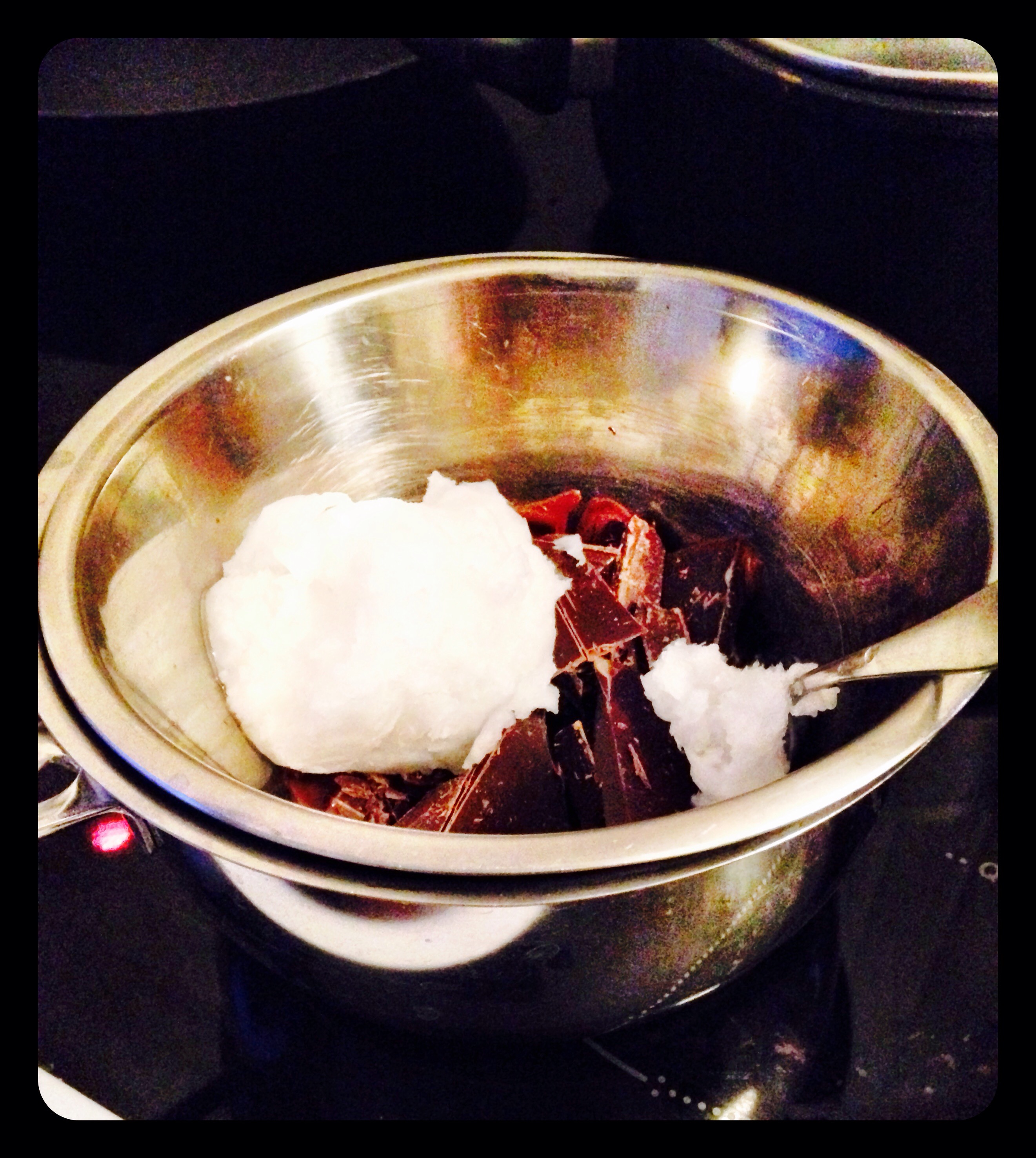 Smält 200g mörk 86% choklad med en dryg dl kokosolja i ett vattenbad ( du kan spara chokladblandningen i en burk i skafferiet om det blir över)