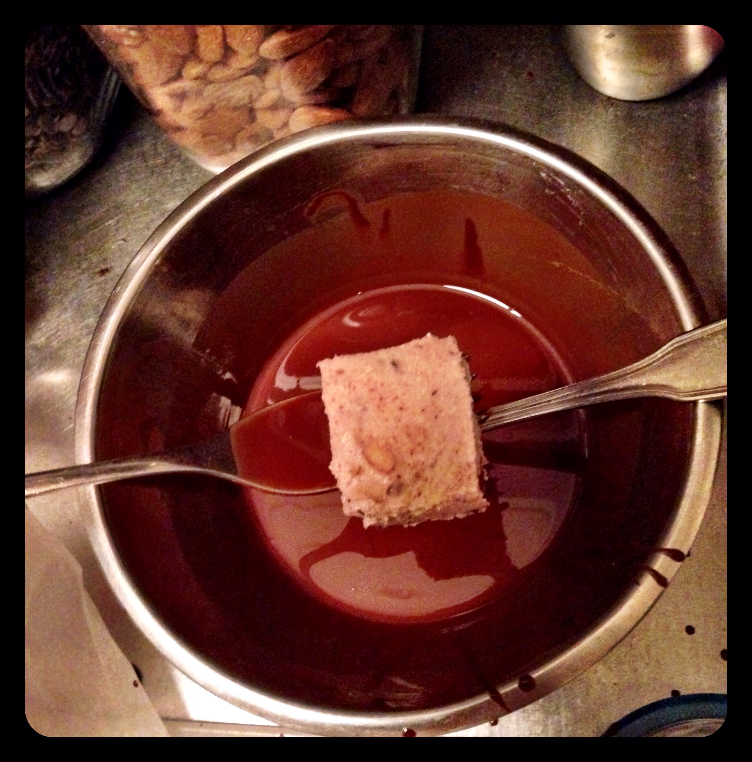 Vänta ett tag på att chokladen blir lite tempererad så går det bättre att göra pralinerna.