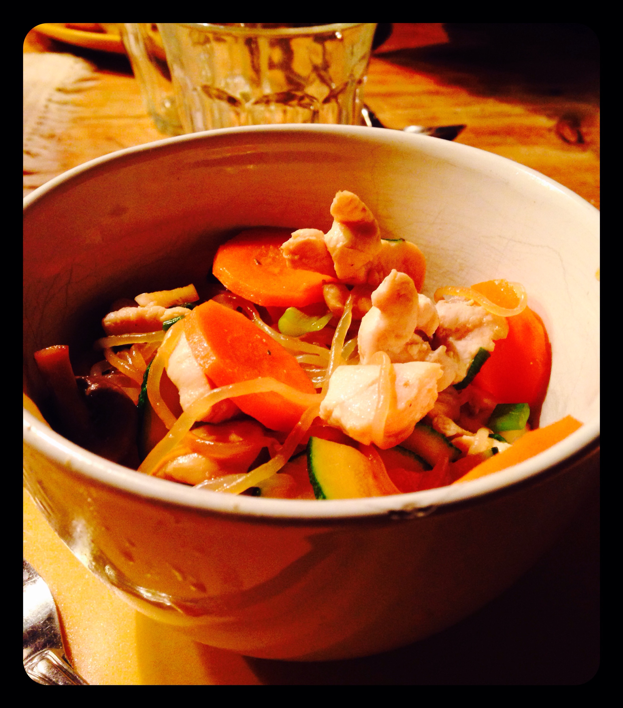 Fräs kycklingen i lite kokosolja. Blanda ner slantade morötter, champinjoner i bitar, zucchini, riven ingefära och finhackad vitlök. Fräs ihop och häll på vattnet.