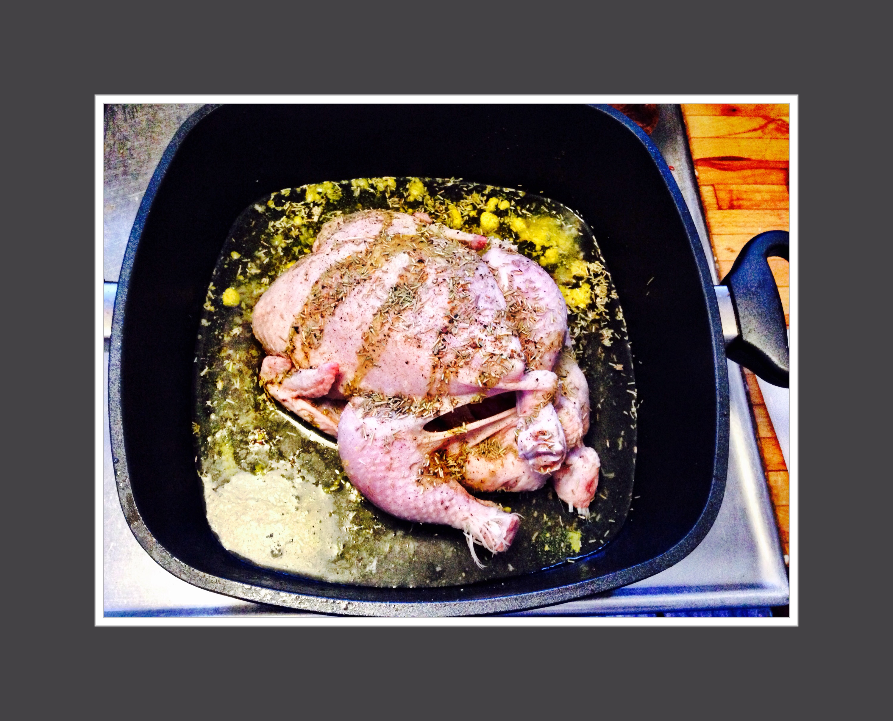 Lägg kycklingen i en gryta eller en form med kanter. Gör man fler än en kyckling så brukar jag använda en plåt.