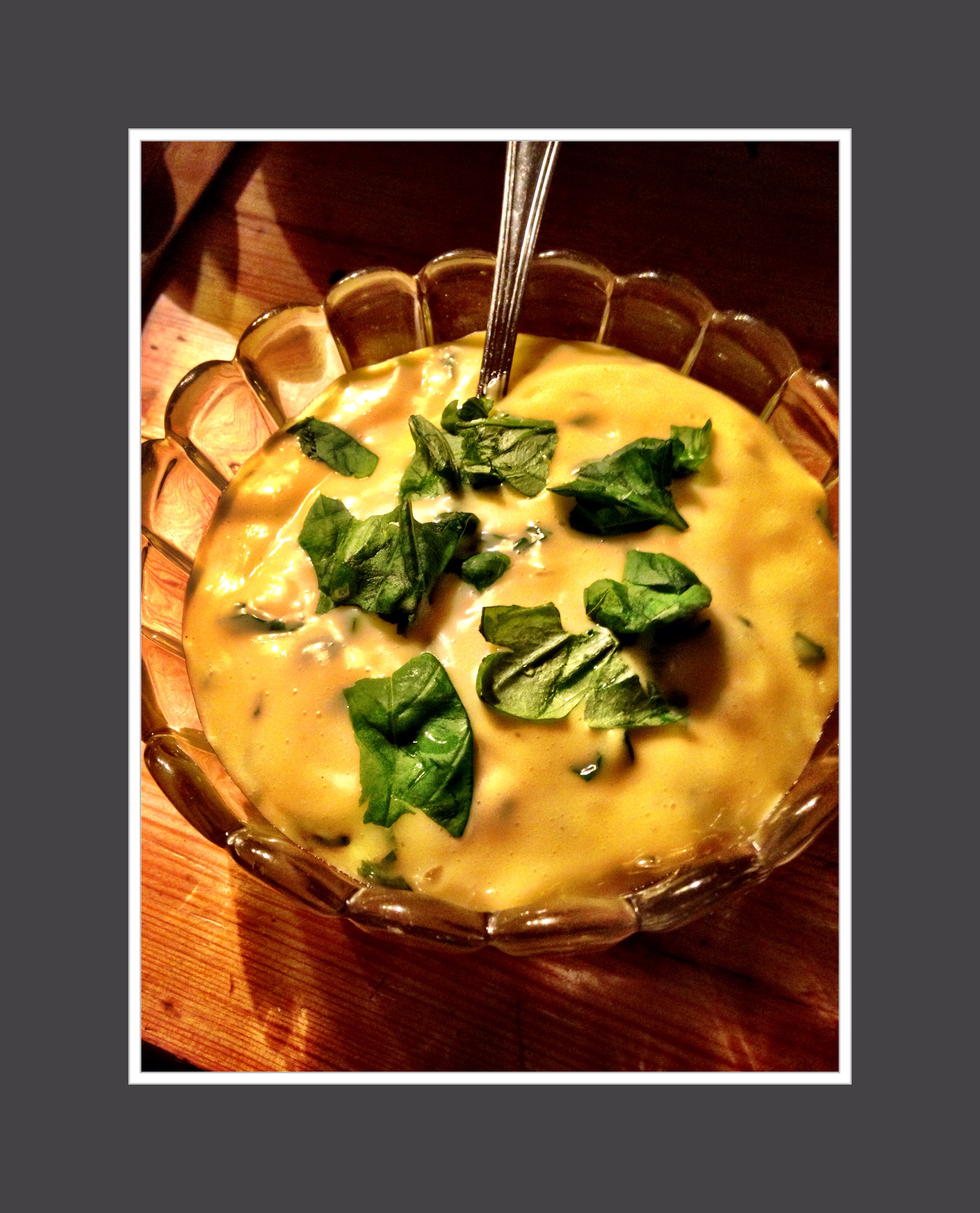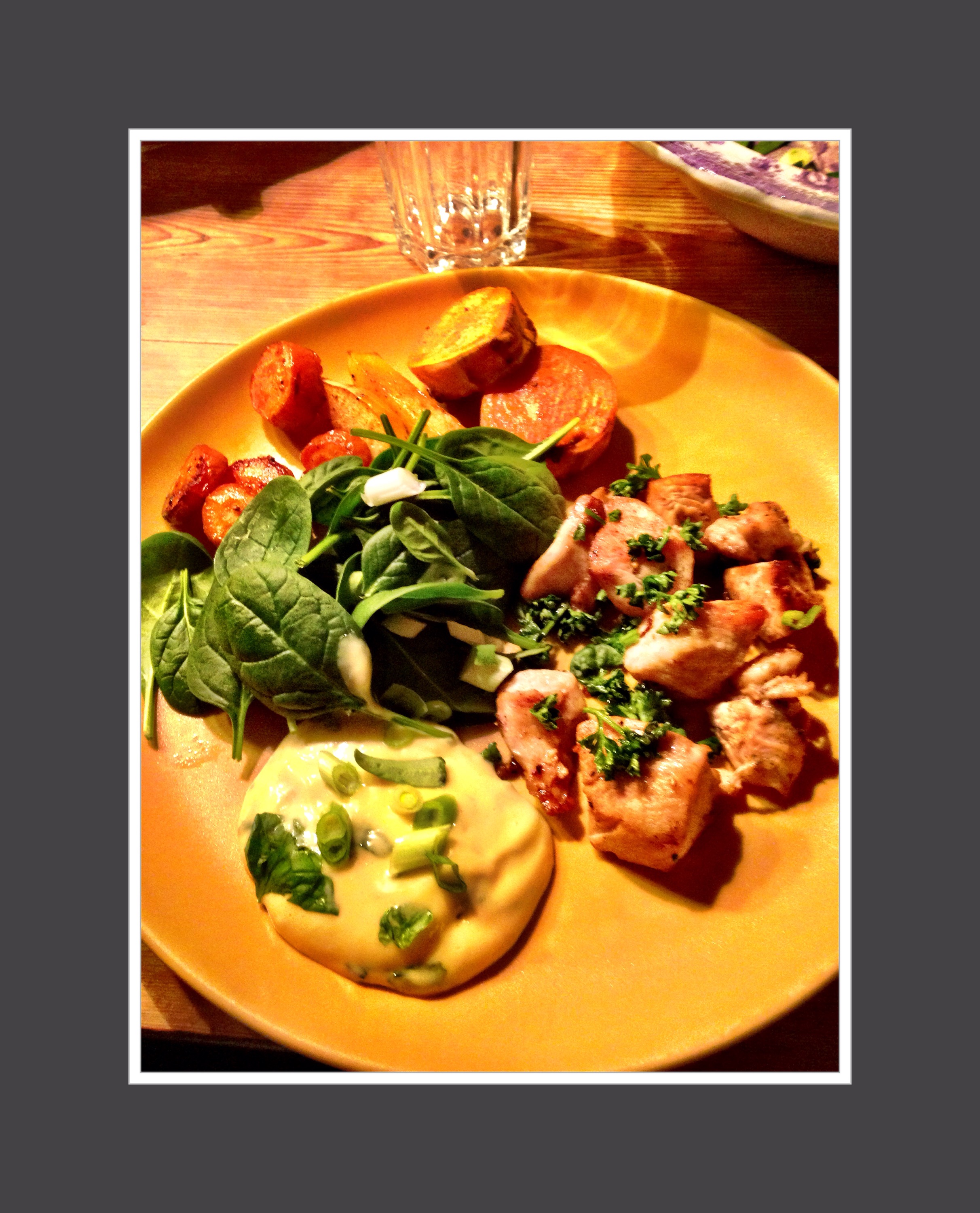Kyckling med sötpotatis och morötter. Spenatsallad med vårlök och en basilikamajonäs.