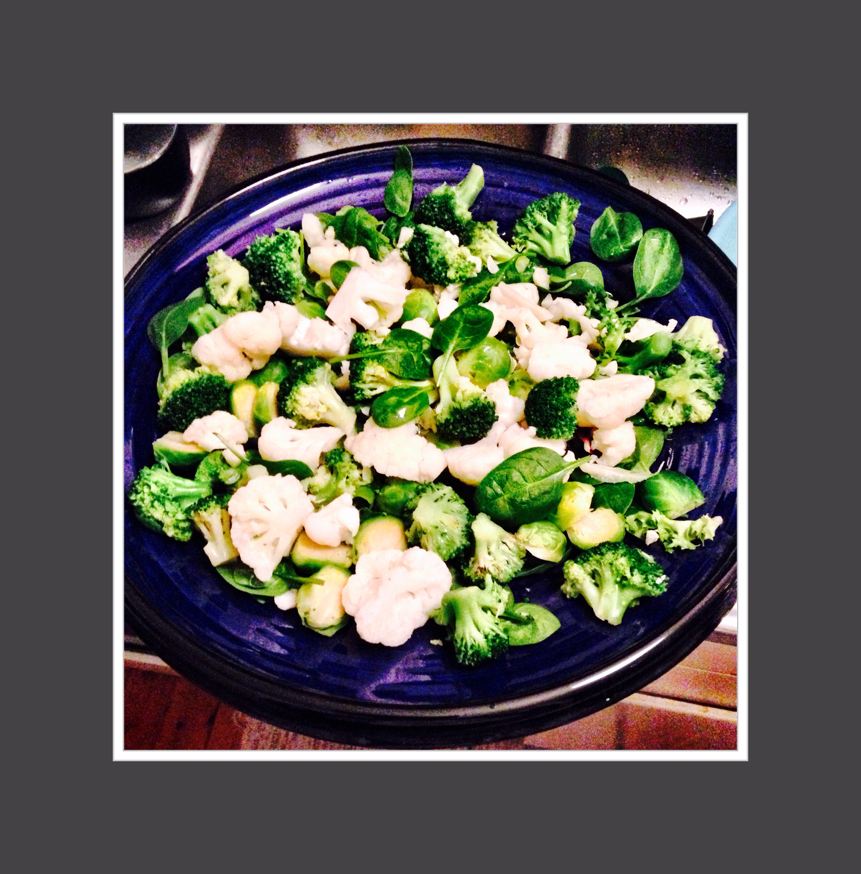 Ta ett stort sallads fat, lägg blandad sallad och spenatblad i botten och fyll sedan på med de kokta grönsakerna.