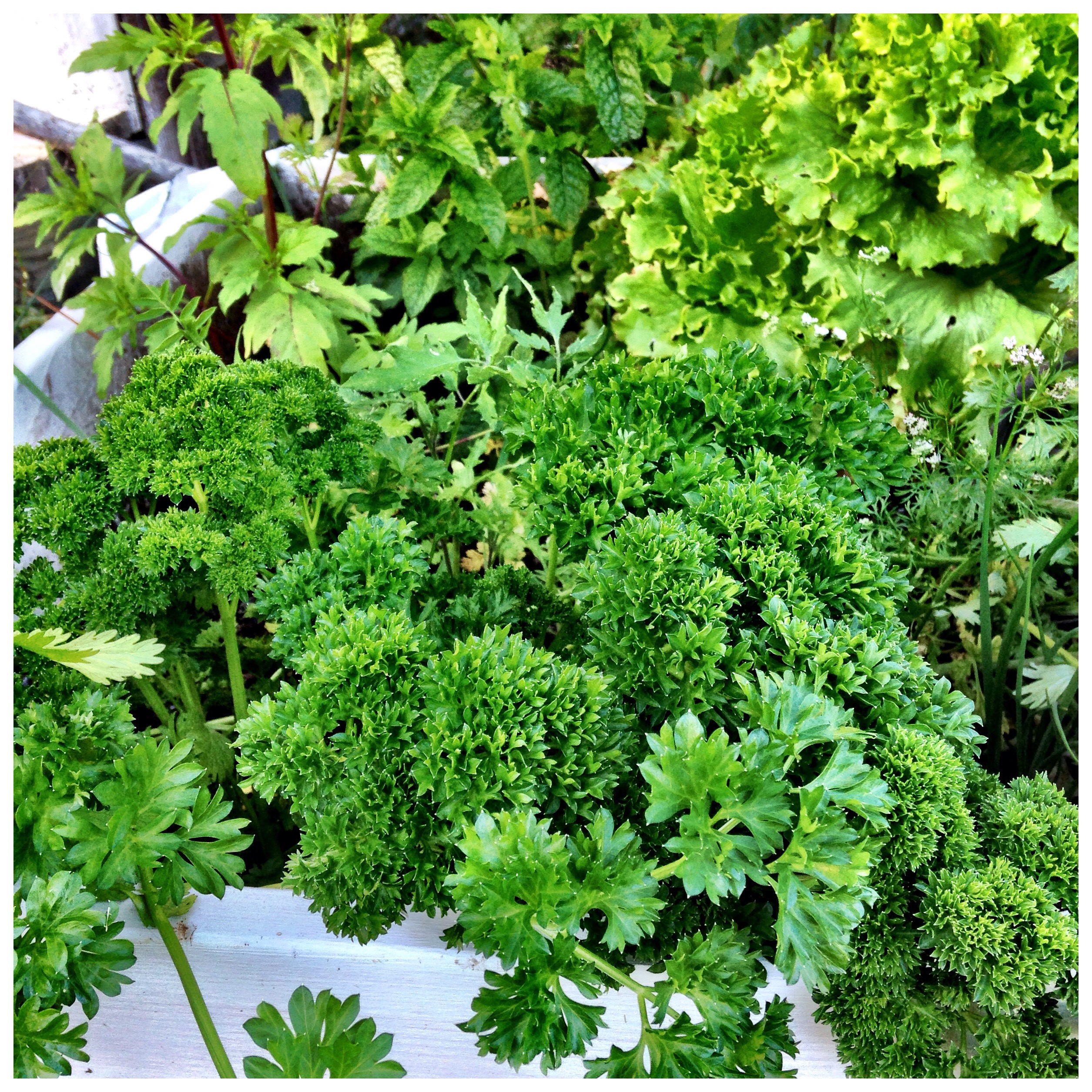 I ‘m Very happy with my pallet collar I got from my husband this spring. Filled it with manure and soil. I just stuffed down the remains of fresh spices I bought at the store. Garlic cloves and salad, Al went down in the soil.
