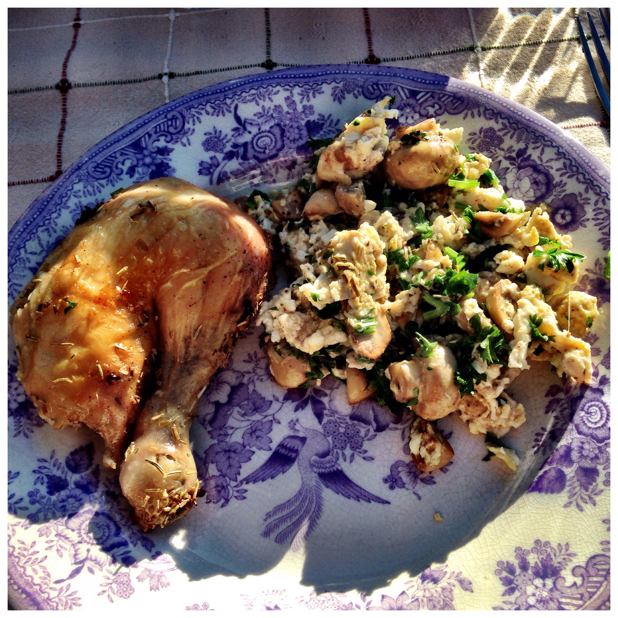 This evening I made rosemary chicken with fried mushroom, mixed with scrambled eggs and sliced home-grown parsley.