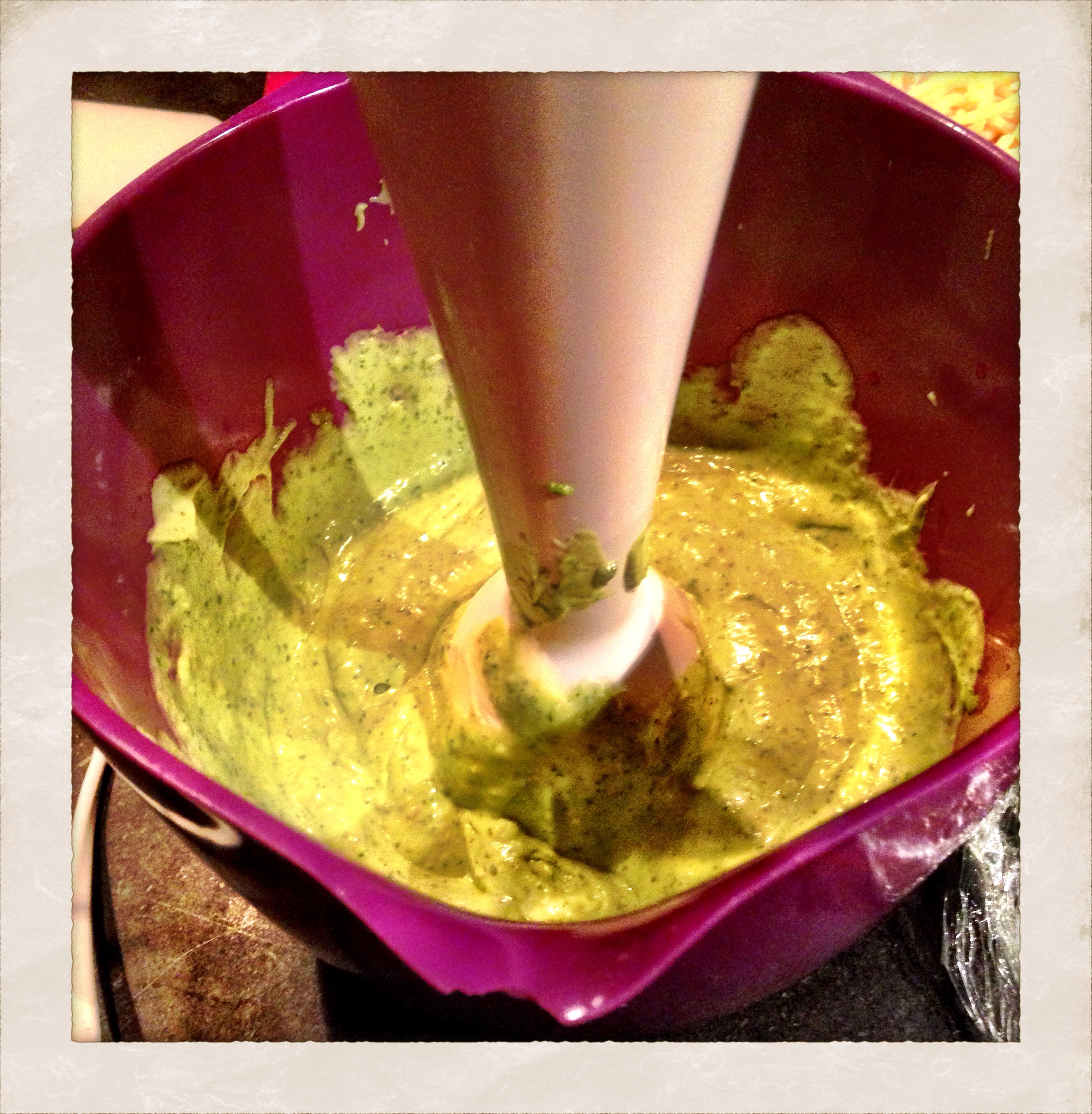 Antingen kör ni äggen i matberedare och strålar ner oljan försiktigt eller så vispar ni med elvisp. Med elvisp bör man vispa gulorna en stund innan man börjar tillsätta oljan. Häll försiktigt i oljan samtidigt som ni vispar. Se till att fånga upp oljan hela tiden. När det ser ut som en majonäs är grunden klar. Tillsätt smakingredienserna.