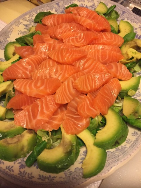 Skär avokado och lägg över, på med ”frusen mango” och skalade räkor. Fin strimla rödlök ( ibland picklar jag rödlöken, en timme innan, i ättika, honung och vatten) gör en dressing på finhackad chili, lime (alt citron) olivolja och massor av koriander. Häll över och salta och peppra.