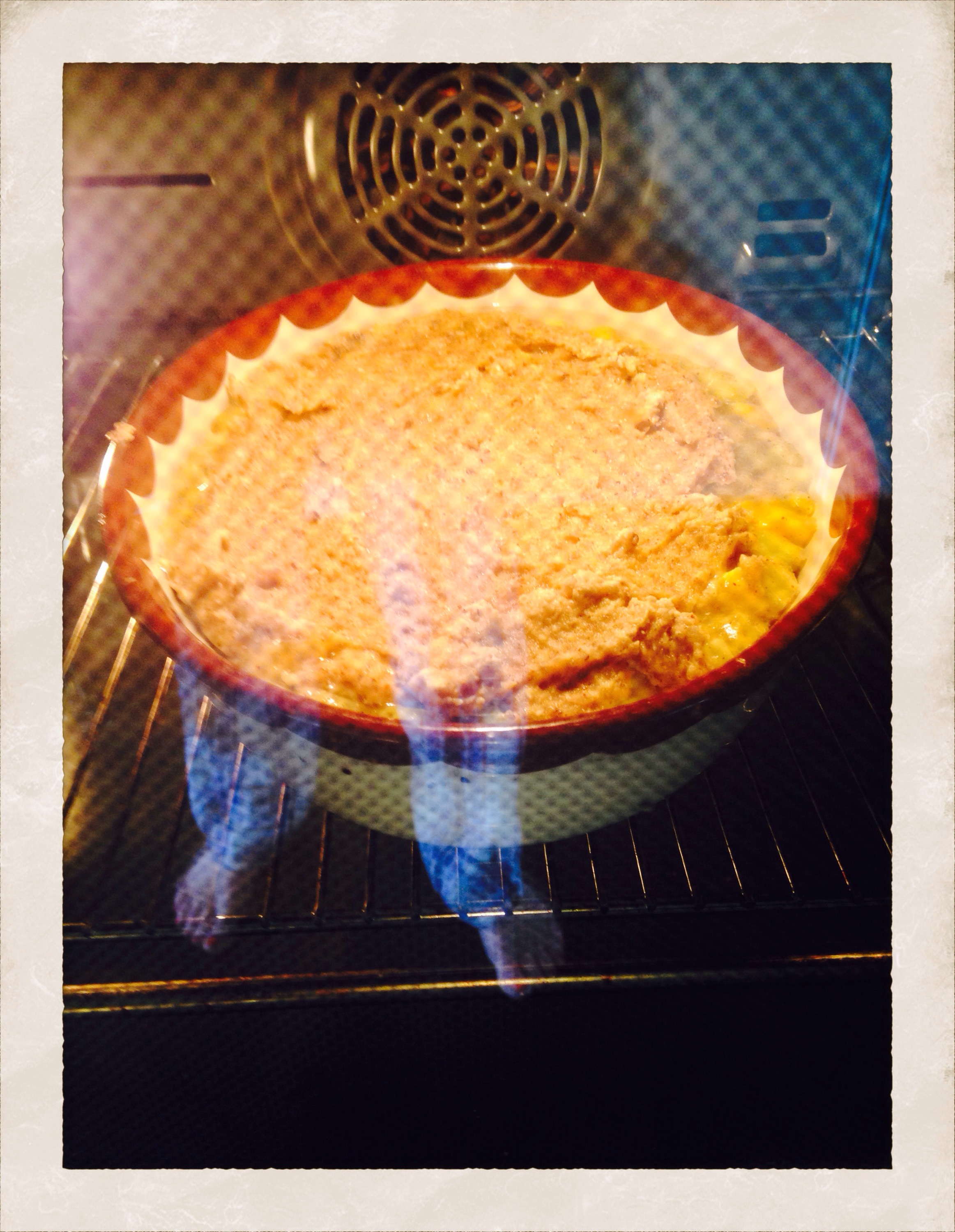 Lägg i hälften av smeten i formen och tryck ut ned en slickepott. Häll på rabarberkoket och fördela ut över formen. Toppa med resterande smet och bred ut deb så den täcker rabarbern. Ställ in i ugnen ca 34 minuter.