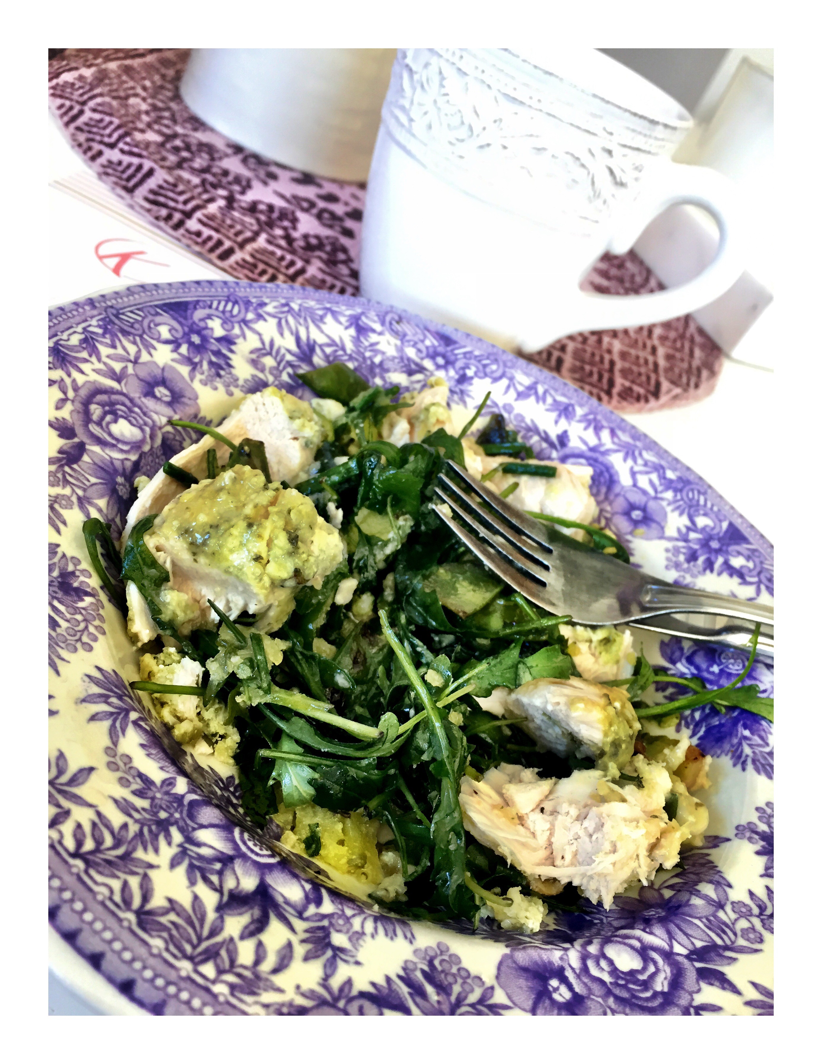 Lunchen blev rester, basilika -kyckling med ruccola och broccoli.
