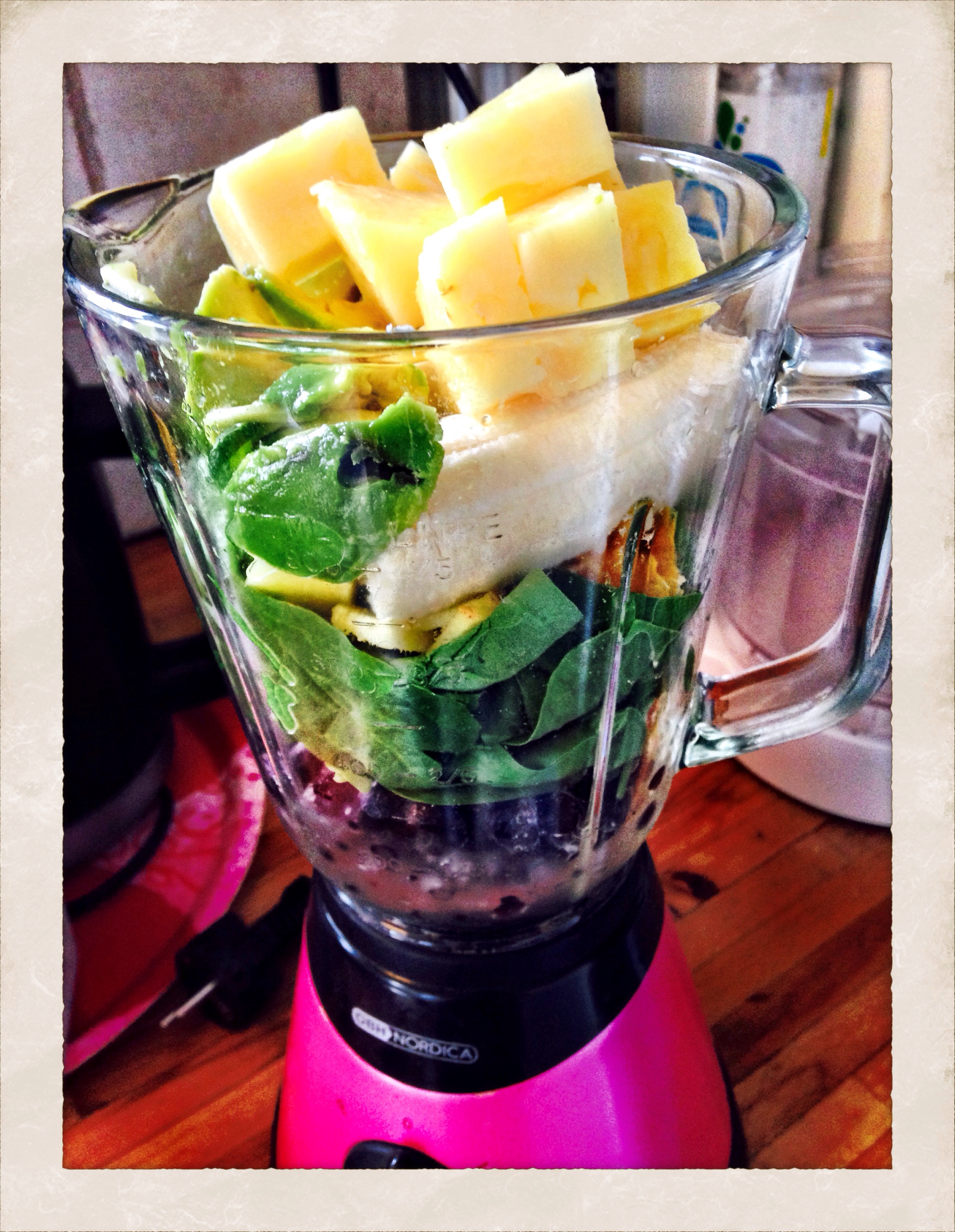 Tonight I needed a boost of nutrients. Made a smoothie of spinach, ginger, lemon, orange, pineapple, avocado, blueberry and banana. Mixed in coconut milk and water.