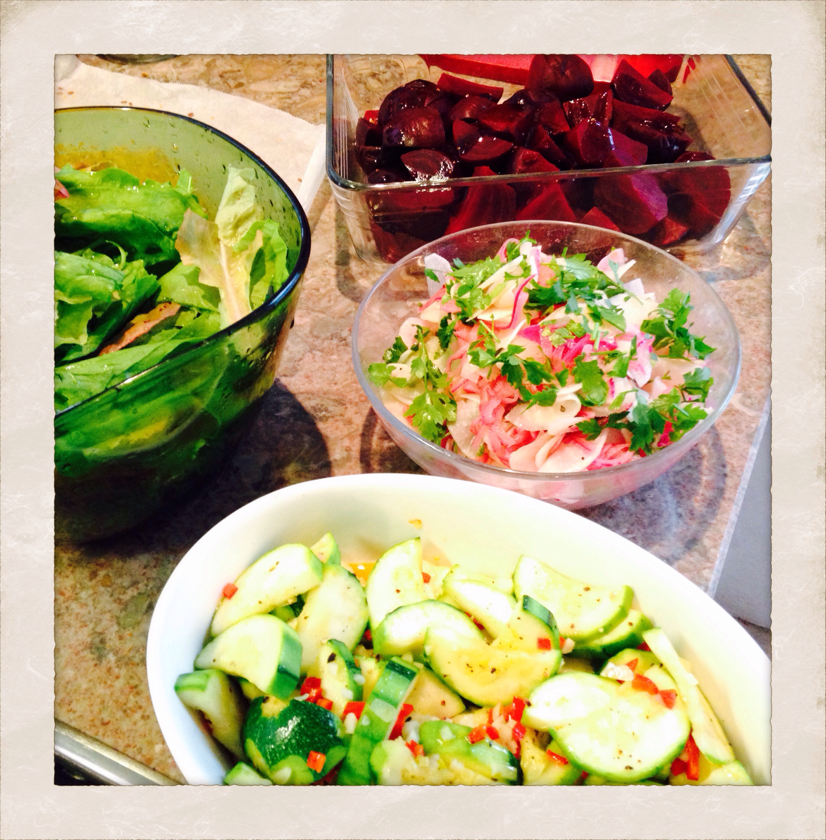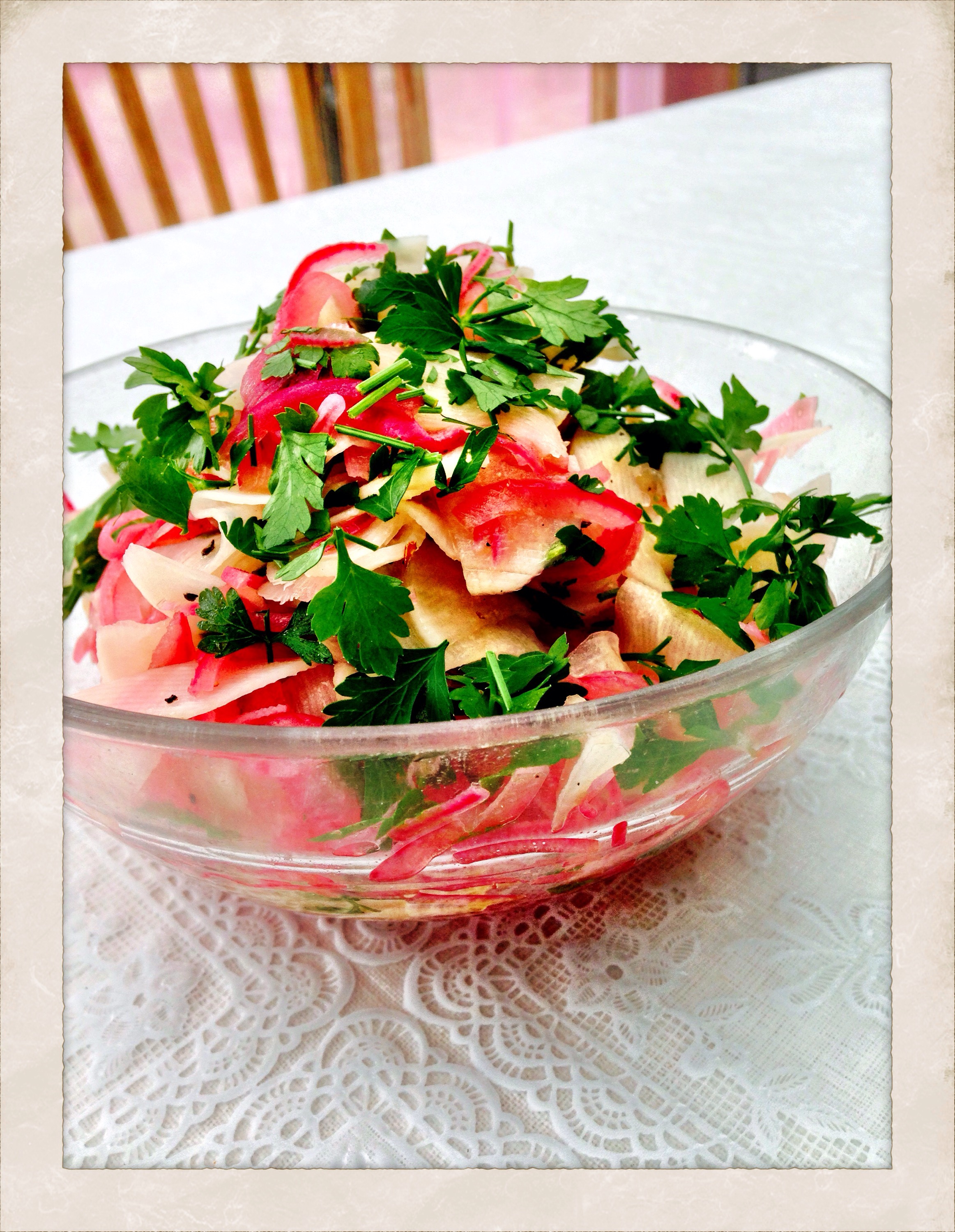 When the vinegar mixture is cooled and the onions are done pour the liquid into a jar and save for later, or add an onion to have in the fridge. The onions that you have pickled you put in with the radish. Toss it around and mix it well. Served topped with some green herbs. I used parsley.