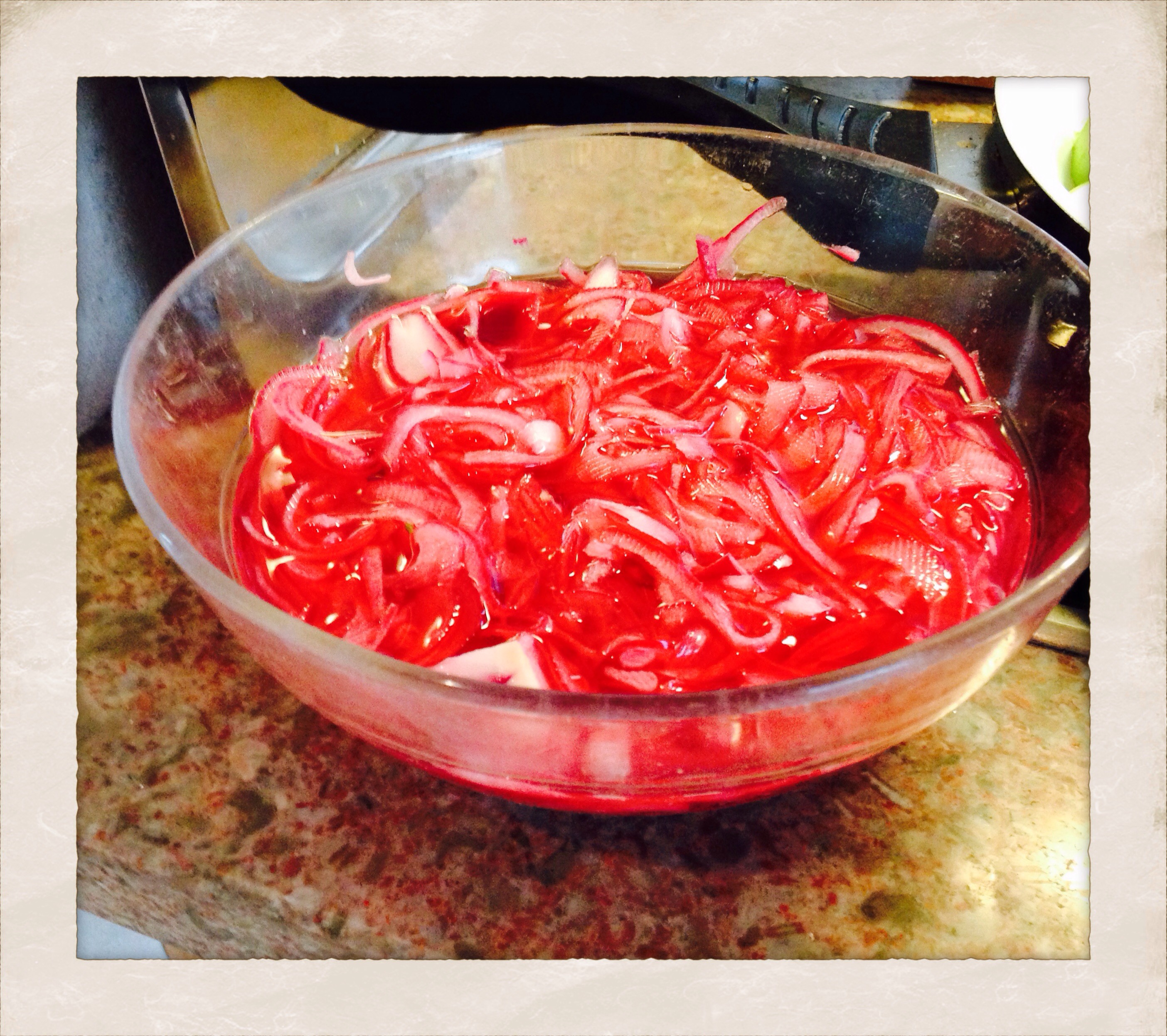 Pickled red onions and white radish.