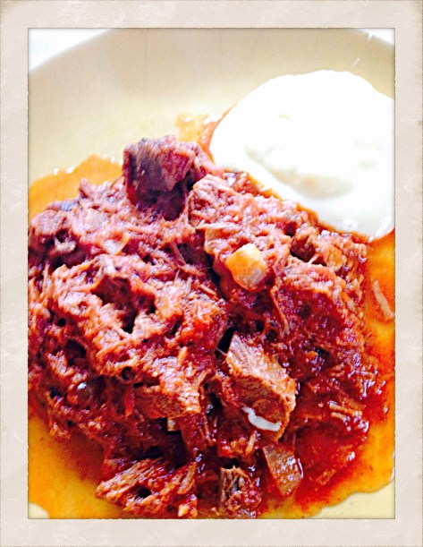 Jag lägger bara in köttet i grytan och häller på lite vatten, ca 5 dl. Sen får köttet sköta sig själv i ugnen i ca 9 timmar på 80 grader.
