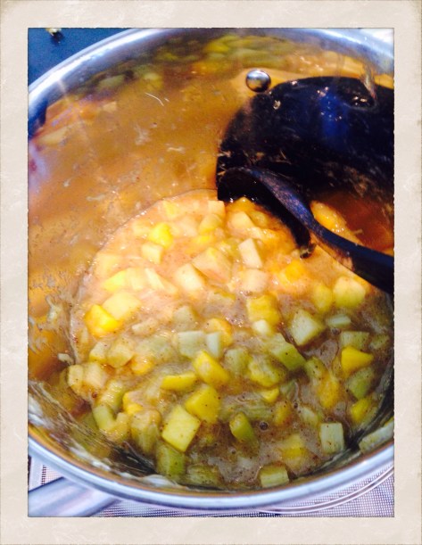 Boil together in fairly low heat.The rhubarb should be soft and a bit ”mushy”