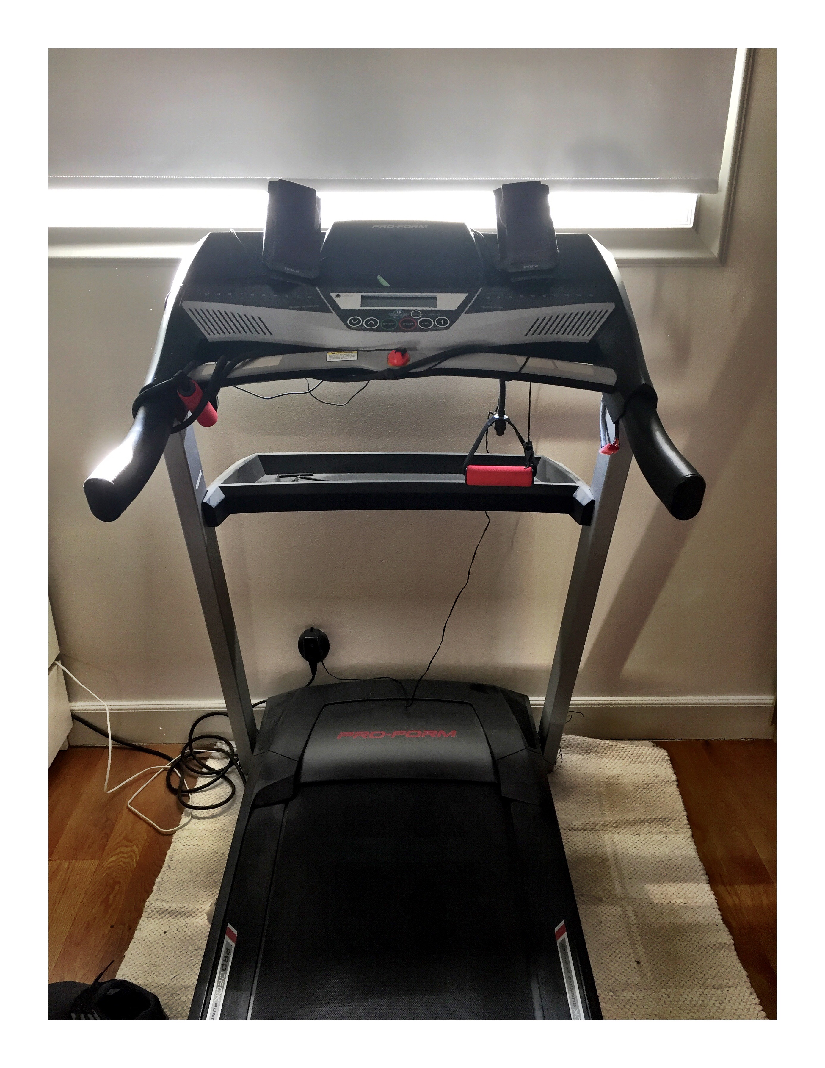 Då kör jag pulshöjande löpning och gång på löpbandet i sovrummet. Har jag ork och tid lägger jag på träning i form av hantlar, gummiband och olika muskelstyrkande övningar.